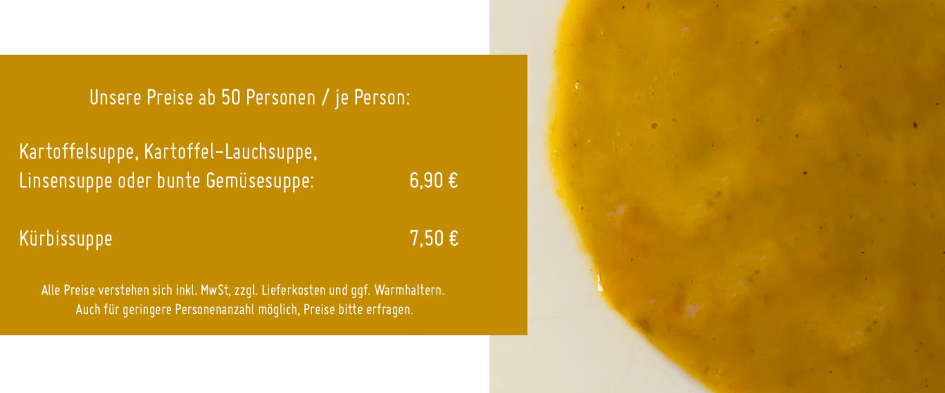 Das Essen ist oft so individuell, wie die Feier selbst. Daher passen wir unser Essen immer deinen Wünschen an. Dennoch möchten wir dir ein paar Möglichkeiten von Suppen, Buffets oder der Ausstattung unserer Pommesbude aufzählen.